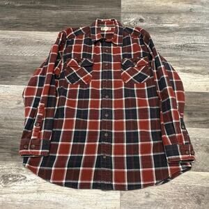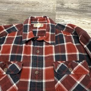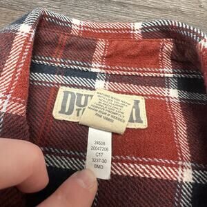 Duluth Trading Red Black Mens XLT Tall Flannel Cotton Plain Tartan Shacket Shirt, please note some stains, heavyweight 100% Cotton Flannel fabric, made in Vietnam, long sleeves, buttoned chest pockets, spread collar, retro classic casual dadcore, mens size XL Tall, 25" by 33"