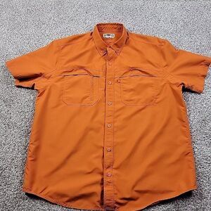 Duluth Trading Shirt Mens XL Orange Button Up Fishing Hiking Vented Short Sleeve. Has marks on front.