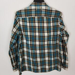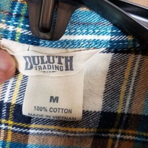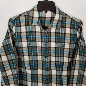 Duluth Trading Women Plaid Button Down Shirt Size M Cottom Gray Blue Long Sleeve