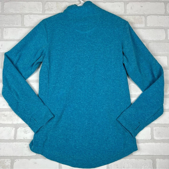 Duluth Trading Women's Small Fleece Jacket Sweatshirt Full Zip Aqua Blue. One small flaw (hole) on back of sleeve near thumb hole)No Chills with Frost Lake Lightweight Fleece Jacket Don't let the thought of crisp conditions give you the chills. Instead, brace yourself for cool adventures with this cozy frost-fighting fleece. Plush inside and out, you'll sink right into the super soft, heathered fleece fabric. It's a lighter weight so you can wear it solo or layer it under a vest or windbreaker for extra warmth. Shaping in the waist makes this fleece figure-flattering, too. 18.5” chest, 27” length. #685