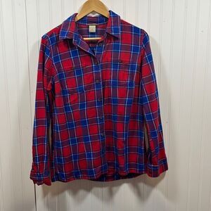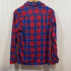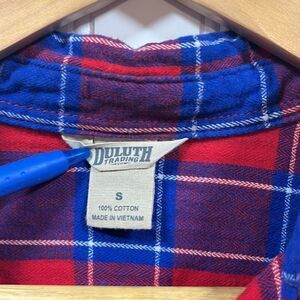 Duluth red and blue plaid flannel long sleeve button down shirt