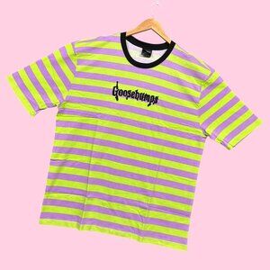 Dumbgood x Goosebumps Logo Stripped Oversized Tee XL measures 26 inches pit to pit 30 inches long Amazing tee perfect for Goosebumps fans Firsthand overstock in great condition