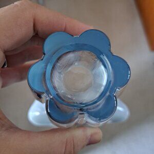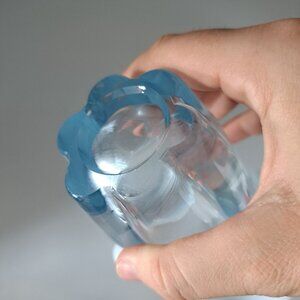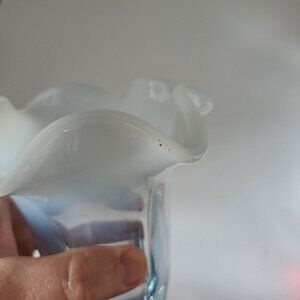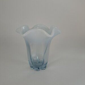 Elegant opalescent blue vase with a ruffled rim, ideal as a centerpiece or decorative piece.