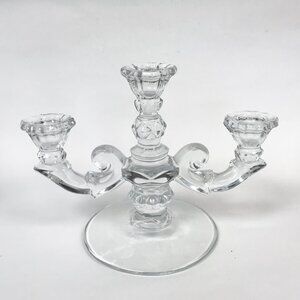 The Duncan Miller Vintage Sandwich Candelabra with Removable Hanging Prisms is a medium-sized candle holder made in the United States. This original piece features a smooth finish and clear color, with dimensions of 6 3/4 inches in height and 8 3/4 inches in width. The candelabra includes removable hanging prisms, adding an elegant touch to any room. Perfect for adults looking to add a vintage charm to their decor. Item will arrive unassembled. Used, in good condition. One of the prisms has a break mark and one has a chip. See all photos for details. Item will be shipped in a recycled Amazon box.
