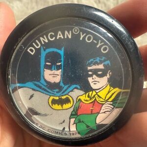 Vintage Duncan butterfly yo-yo from 1978 with Batman and Robin design. Classic yo-yo with a flared butterfly shape. Licensed product from DC Comics. Must have for any yoyo collector or Batman fan. Comes with a case that says “dark knight” on it. Made in the USA. Good vintage condition with light signs of wear. See photos for details - sold as is. Please look at pictures for more details and let me know if you have any questions. Photos are a part of item description! Thanks!