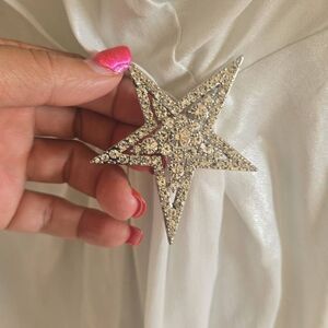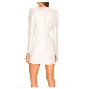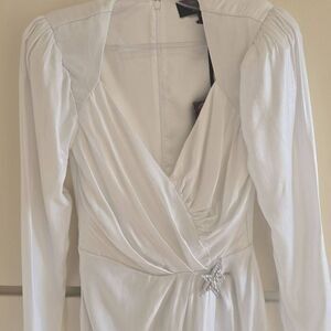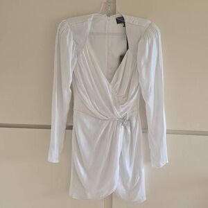 NWT Dundas X Revolve Harlow Metallic Ivory Mini Wrap Dress (M)Missing the silver star at waist. • Self: 100% viscoseLining: 97% poly, 3% spandex • Made in China • Hand wash • Fully lined • Hidden back zipper closure/ zip wrists• Surplice front with ruched detail and crystal embellished star brooch • Padded shoulder with zipper closure at cuffbCrepe fabric with metallic finish Retail:$368