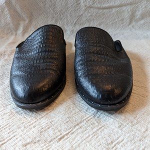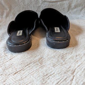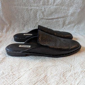 Beautiful black leather slip-on mules from Dune London. Embossed crocodile leather, loafer cut. Edgy silver hammered nail accents around the trim.