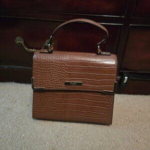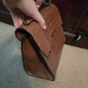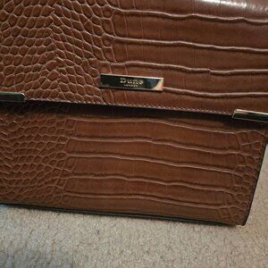 Dune London Brown Faux Croc Embossed Crossbody Purse - detachable crossbody strap and a little money coin pouch wallet that comes with it. Light brown color with golden hardware and accents. Logo name plate on the front with gold edges and hardware on the straps. Top handle crossbody bag. Croc embossed faux leather. Excellent preowned condition, minimal wear. Snap closure front. Black lined inside with logo written throughout. Zipper pouch inside. Classic purse for any occasion casual, work attire, or formal wear. Wear as crossbody or as a satchel bag.