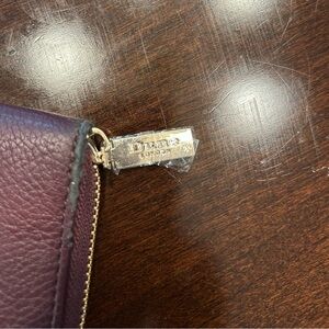 Experience the refined elegance of the Dune London Purple Wallet, crafted with a luxurious textured finish and adorned with a chic gold-tone nameplate. This stylish accessory is perfect for keeping your essentials organized while adding a touch of sophistication to your ensemble. Zipper pull is still in protective plastic. IMPORTANT: there is damage on both lower corners. But interior is new and unused.