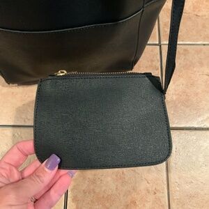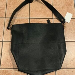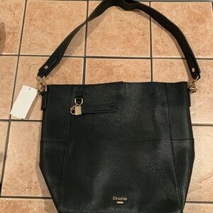 Dune London Shoulder Bag in black. Inside is one large pocket. The shoulder strap is separating and there is a scratch on one side. Polyurethane. New without tags.