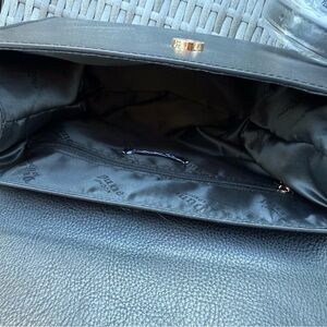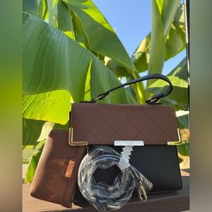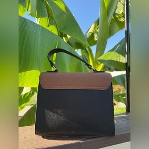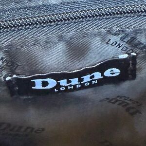 Elegant Dune London bag with a two-tone design. Features a quilted brown flap and sleek black body. Perfect for any occasion.