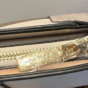 This dune bag is new without tags. There is still the plastic on all of the gold accents. It is a pale tan with gold and bronze panels. His bag has gold hardware and an adjustable strap. Plenty of room for all of your essentials. Zipper clothes, and internal zippered pocket and two side pockets.