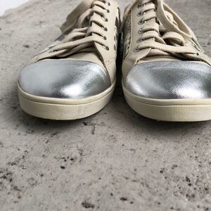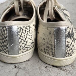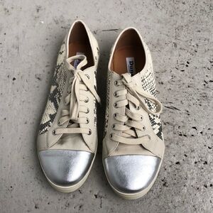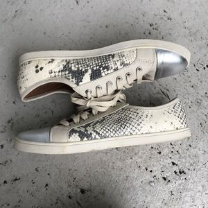 Those are leather sneakers that are in printed with the silver snake print. Toe is silver. They are in good condition. Size says 8/41 I think they fit more like a 10 but please know your size in this designer