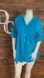Dunes Button Down Tunic Blouse. Quarter Roll Sleeves. Split V-Neckline. Pleated Front. Rounded Hemline. Vibrant Blue Color.