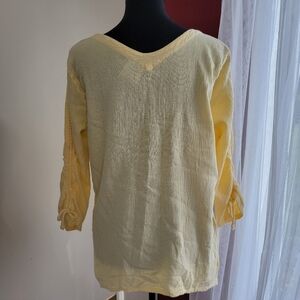 Dunes v-neck tunic. 100% yellow cotton. Lightweight. Cut out design along side seams. Tapers from center hem to longer sides. Measures 20" flat underarm seam to seam. Adjustable shirred sleeve measures 16". 23.5" length at center. Size 1 (Sm/Medium)
