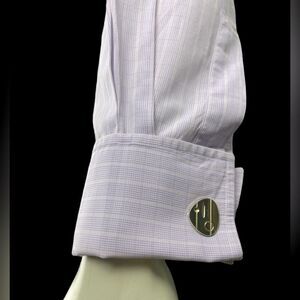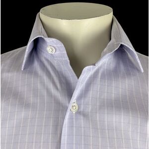 Stunning L/S casual button down with French cuffs, made in Italy, and 100% cotton. Unmistakable European styling from Dunhill London, this beautiful dress shirt is lavender and light blue plaid. The size large measures as follows: