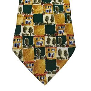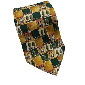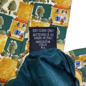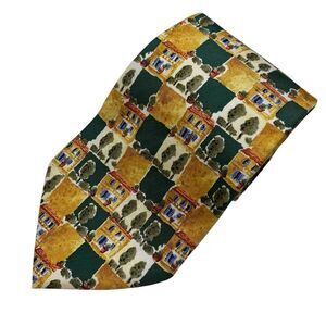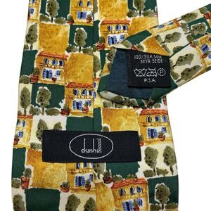 Dunhill Silk Necktie Men's Tie Houses Trees Green Yellow Ivory Made in Italy