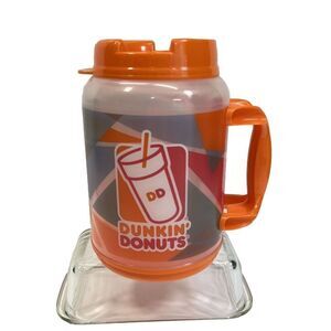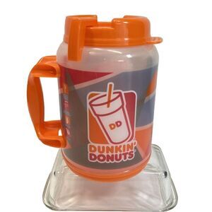 Up for sale is a colorful 64oz travel tumbler from Dunkin' Donuts. This drink jug features a fun design with gray, pink and orange accents and is perfect for carrying your favorite drink on the go. The tumbler is an original piece and was created in 2017. The brand, Dunkin' Donuts, is well-known for its delicious coffee and this tumbler is perfect for any coffee or tea lover. Whether you're commuting to work or going on a road trip, this tumbler is both stylish and functional.