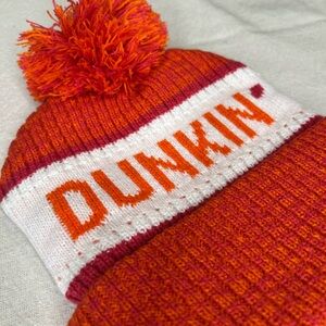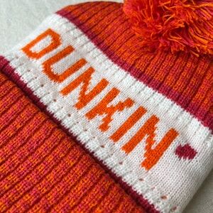 Stay cozy and stylish with this fun Dunkin’ knit beanie. Featuring Dunkin’s signature orange, pink, and white colors with a bold DUNKIN logo, ribbed cuff, and playful pom pom top. Perfect for coffee lovers, collectors, or anyone looking for a bright and warm winter hat.