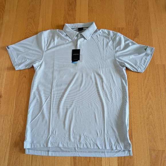 Dunning golf short sleeve polo white with gray stripes. Dunning logo on right sleeve "Regions" bank logo on the left sleeve.