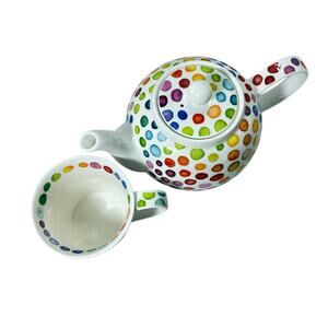 Bright and cheerful Dunoon Fine Bone China “Hot Spots” teapot and matching mug, designed by Caroline Bessey in Staffordshire, England is a Modern Dunoon Classic. Decorated in her signature colorful watercolor polka dots, this set is a highly sought after modern collectible. Perfect for daily tea or to add to your Dunoon collection.
