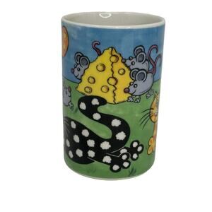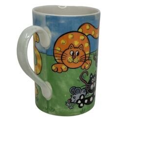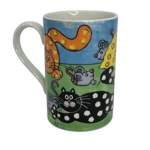 OTEM IN EXCELLENT PREOWNED CONDITION. This Dunoon stoneware mug features a playful design titled "Cat and Mouse Game" by Jane Brookshaw. The mug is perfect for all occasions and can hold one serving of your favorite hot beverage. Its contemporary style and colorful, multicolor cat-themed pattern make it a great addition to any household.