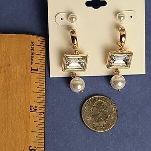 Duo Drop Dangle Square Faux Pearl Push Back Hoop Earrings Gold Tone White-Clear