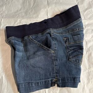 Dark blue jean shorts with a comfortable waistband. Ideal for casual wear.