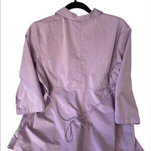 Lavender woven collared shirt / blouse with slight stretch. V-neckline has faux wrap styling. Empire waist with back ties to allow for changing shape. Item is in excellent condition and was laundered.