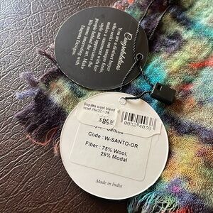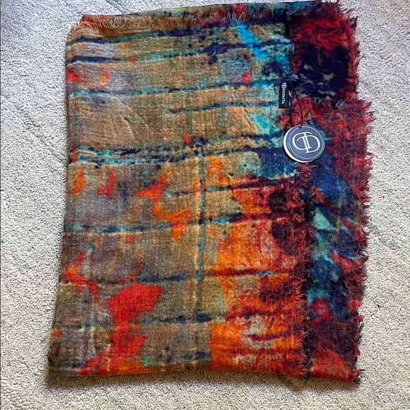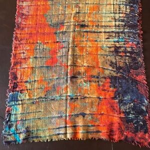 72” long by 26” wide 75% Wool 25% Modal scarf in warm tie dye shades.