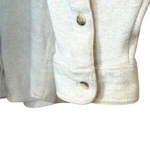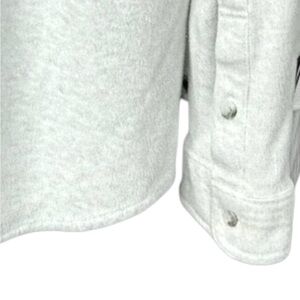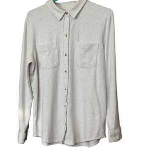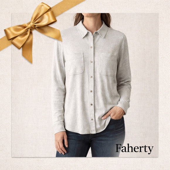 Faherty long sleeve button-front knit shirt in a soft heathered gray. Premium stretch blend with collared neckline, dual chest pockets, and tonal buttons. Medium weight and comfortable, and ideal for layering.