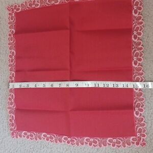 dupont cloth napkins. two packages of four napkins each. the packages are opened but the napkins have not been used or washed. floral lace edges. one pack in coin gold. one pack in bright red. vintage. 65% Dacron polyester, 35% cotton. new without tags.