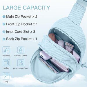 Features: This cute mini sling bag features an eye-catching initial letter patch, adding a personalized touch to your look. With its spacious interior including 2 main zipper compartments, a back zipper pocket, 3 card slots, and a slash slot, it keeps all your essentials neatly organized and easy to access. Made from soft, high-quality corduroy, it's lightweight yet durable for daily wear. The adjustable strap extends from 28.93 to 52.97 inches, making it versatile enough to wear as a crossbody, fanny pack, chest bag, or sling backpack — great for travel, errands, outdoor adventures, or casual outings.