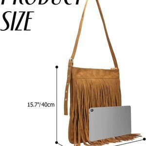 Features: Made with durable, soft vegan suede, this roomy hobo bag has a relaxed slouchy shape and playful fringe detailing. The adjustable strap lets you wear it as a crossbody or shoulder bag, making it super versatile. Inside there's a main compartment plus an internal slip pocket—big enough for your phone, wallet, cosmetics, and more.