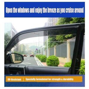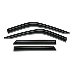 The product is a set of durable rain guards specifically designed for the Ford Explorer 2020-2024 models. These dark tinted sun visors are made of plastic and come with adhesive tape for easy installation. They offer a sleek black color and are designed for a universal fitment at the left and right placements on the vehicle. These guards help to deflect sun, rain, and bugs while adding a stylish touch to the exterior of the car.