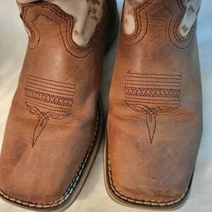 Stylish cowboy boots with a brown leather base and camouflage pattern. Perfect for outdoor adventures.