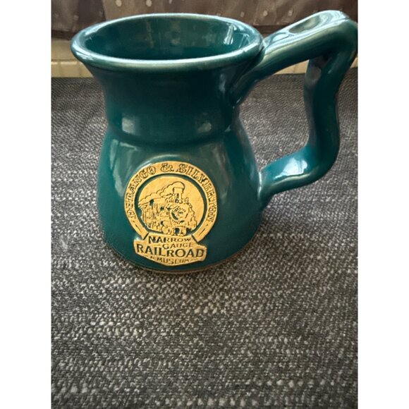 This green ceramic mug once served as a memento from the historic Durango & Silverton Narrow Gauge Railroad Museum. Its sturdy handle and glossy finish evoke the charm of bygone rail adventures, making it a timeless keepsake or a warm companion for coffee-filled mornings.