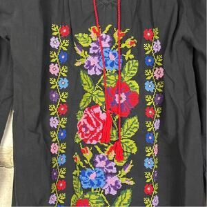 Description: gorgeous black blouse amazing embroidery down the front, neckline and arms, ties at the wrist crew neck.