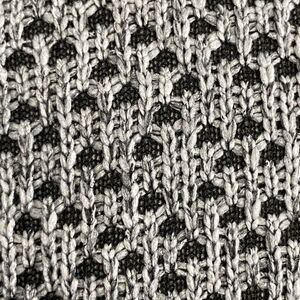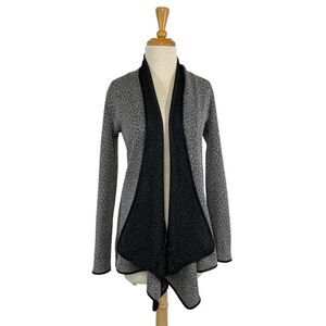 This striking open front cardigan features a double knit pattern of light bluish gray cut-out upside down hearts over a black lining and black trim.