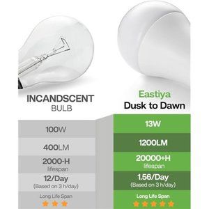 🧿1200LM Ultra-High Brightness: Eastiya 13W dusk to dawn sensor bulb matches the brightness of traditional 100W incandescent bulbs. It generates a brilliant 1200 lumens of light without causing Eastiya Dusk to Dawn Sensor LED Outdoor Light Bulb, Daylight White 5000K, A19 13W(100 Watt Equivalent) Bright Porch Lighting, 1200LM, Auto-On/Off Photocell Sensor for Garage Yard Patio Garden-4 Packany flickering or glare issues.