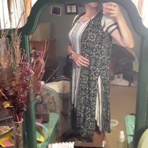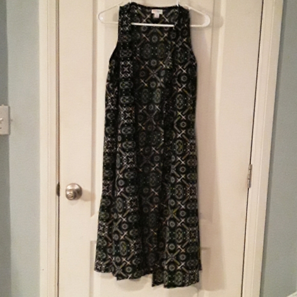 Black, sleeveless, lightweight duster by Lularoe. It flows so gently in the breeze. Beautiful turquoise pattern. Gently used.