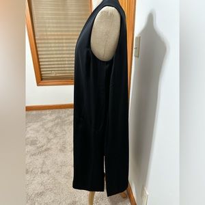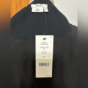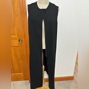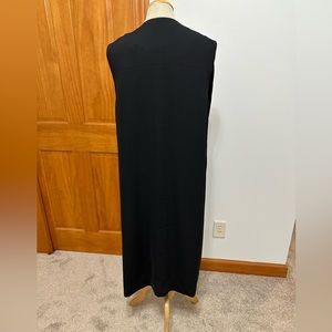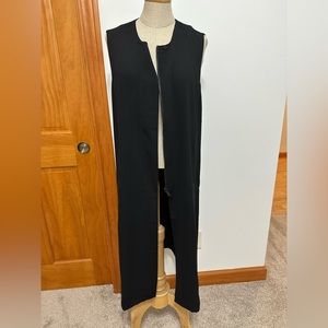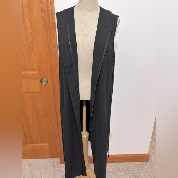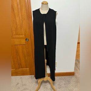 DKNY Duster in black. Length is 40” and can be worn open or zipped. Also has button detail at the top so it can be worn buttoned while the rest is flared open