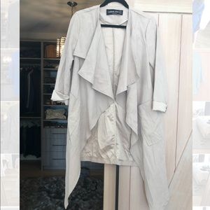 Beige microfibre duster jacket. Size small. Never worn - excuse wrinkles from moving! No trades