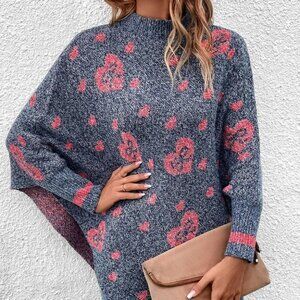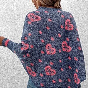 Dusty Blue Preppy Womens Heart Pattern Batwing Sleeve Asymmetrical Hem Sweater