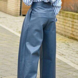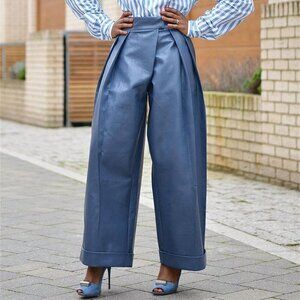 Dusty Blue Elegant Womens Faux leather Baggy w/Pockets Pants high street fashion