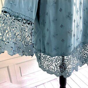 Dusty Blue Embroidered Blouse long Lace edges Alessa W 10
