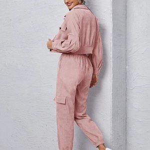 Dusty Pink Corduroy Flap Detail Jacket With Tie Front Cargo Pants