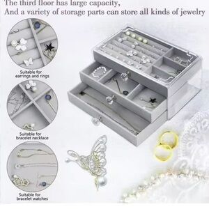 This elegant jewelry box in a soft dusty pink color features a sleek, glossy finish that adds a touch of sophistication to any space. With its rectangular shape and three spacious drawers, it offers ample storage for your accessories. The star-shaped silver handles provide a charming contrast, making it both functional and stylish.