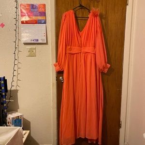 Hello, this dress is brand new and was custom made. It has a zipper back. It’s plus sized and has long sleeves. The right shoulder has a little floral detail and there’s a slit on the left side. I hope you find this helpful! Have a great day!!