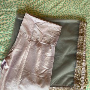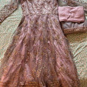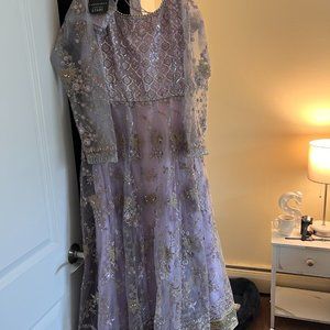 Dusty Purple Net Anarkali is an ode to traditional fashion. The net bodice has been encrusted with a jaal of gold + silver embellishments set wrought with sequins and zari. The beautifully worked stitched belt parts the flare from the body. The lower part of the frock features a garden of floral motifs replenished in mesmerizing shades of gold and purple. The hem has been aesthetically finished with embroidered overlaid laces. The ensemble has been completed with a similar dusty purple dupatta with a chatta patti finishing.